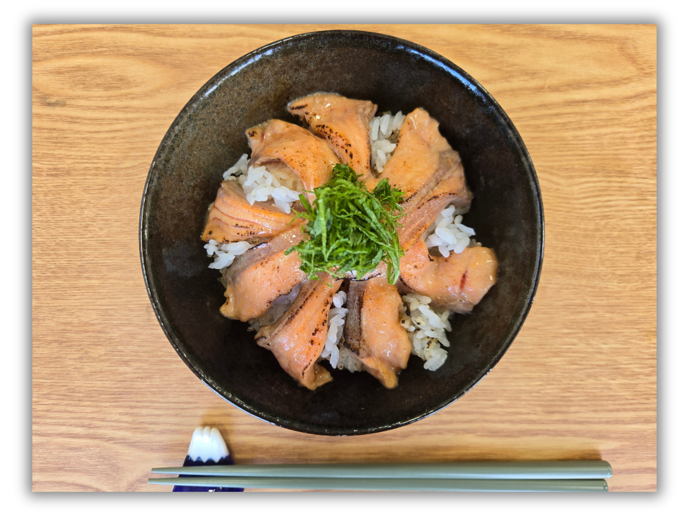ごはんの上に漬け込んだ3、大葉、塩コショウを盛り付けたら完成